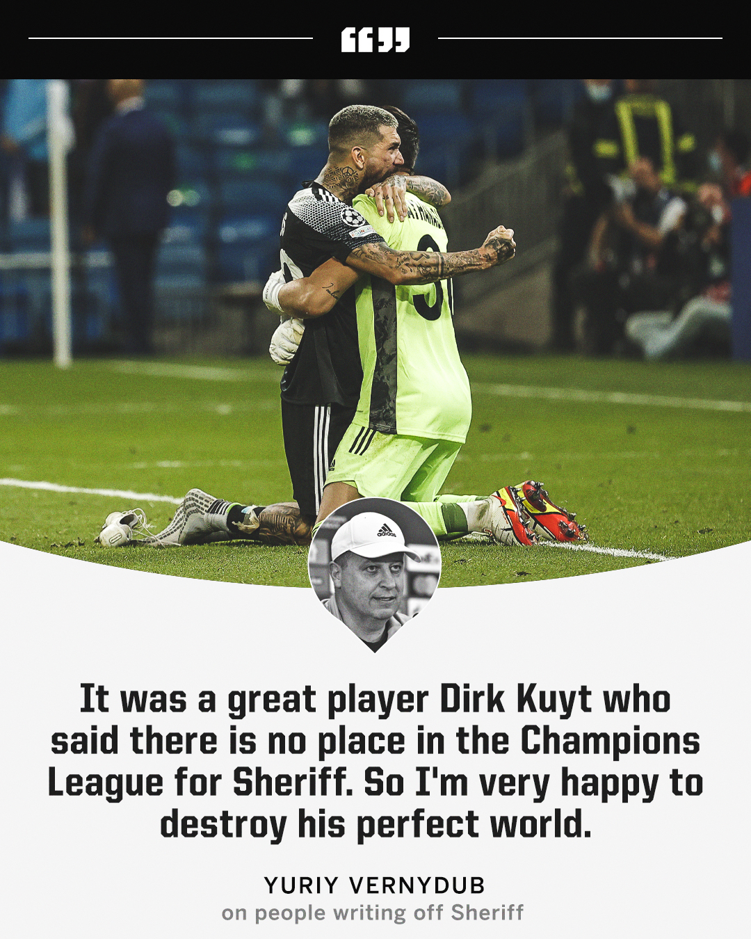 He said I know that the Champions League is a competition for. After Sheriff qualified former Liverpool striker Dirk Kuyt told Dutch news outlet RTL 7 that the club had no place in the Champions League. Sheriff Tiraspol manager Yuriy Vernydub has verbally dismantled Dirk Kuyt following the clubs win over Real Madrid - because the Dutchman said they dont belong in the Champions League.